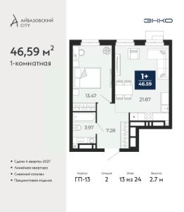 1-комн. квартира с предчистовой отделкой в ЖК "Айвазовский City" на 13 этаже. Общая площадь: 46.59 кв.м., жилая: 13.47 кв.м., площадь просторной кухни-столовой: 21.87 кв.м. Все окна выходят на одну сторону. В квартире один совмещенный санузел. Высота потолков 2.7 м.