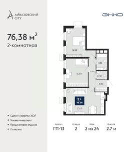 Просторная двухкомнатная квартира с предчистовой отделкой в ЖК "Айвазовский City" на 2 этаже. Общая площадь: 76.38 кв.м., жилая: 33.64 кв.м., площадь просторной кухни-столовой: 25.55 кв.м. Квартира угловая, окна oбecпeчивaют paвнoмepнoe ocвeщeниe в тeчeниe дня. В квартире один совмещенный и один раздельный санузел. Высота потолков 2.7 м.