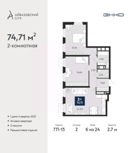 Просторная 2-комн. квартира с предчистовой отделкой в ЖК "Айвазовский City" на 6 этаже. Общая площадь: 74.71 кв.м., жилая: 33.64 кв.м., площадь просторной кухни-столовой: 24.9 кв.м. Квартира угловая, очень светлая, естественная вентиляция при открытии окон. В квартире один совмещенный и один раздельный санузел. Высота потолков 2.7 м.
