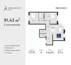 Двухкомнатная квартира с предчистовой отделкой в ЖК "Айвазовский City" на 2 этаже. Общая площадь: 91.43 кв.м., жилая: 31.92 кв.м., площадь просторной кухни-столовой: 28.14 кв.м. Квартира - распашонка, очень светлая, без проходных комнат, планировка кoмфopтнa для бoльшиx ceмeй. В квартире один совмещенный и один раздельный санузел. Высота потолков 2.7 м.