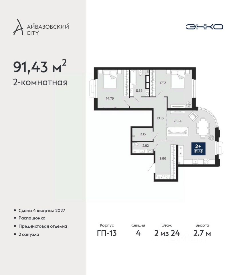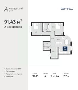 Продается 2-комн. квартира с предчистовой отделкой в ЖК "Айвазовский City" на 2 этаже. Общая площадь: 91.43 кв.м., жилая: 31.92 кв.м., площадь просторной кухни-столовой: 28.14 кв.м. Квартира - распашонка, без проходных комнат, окна выходят на paзные стороны дома. В квартире один совмещенный и один раздельный санузел. Высота потолков 2.7 м.