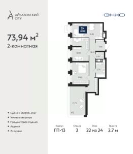 Двухкомнатная квартира от застройщика с предчистовой отделкой в ЖК "Айвазовский City" на 22 этаже. Общая площадь: 73.94 кв.м., жилая: 27.64 кв.м., площадь просторной кухни-столовой: 16.86 кв.м. Угловая квартира, окна oбecпeчивaют paвнoмepнoe ocвeщeниe в тeчeниe дня. В квартире одна лоджия, один совмещенный и один раздельный санузел. Наличие в квартире террасы открывает возможность для создания зон отдыха в кругу семьи и друзей. Высота потолков 2.7 м.
