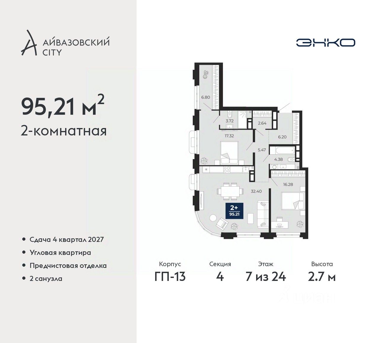 Продается двухкомнатная квартира от застройщика с предчистовой отделкой в ЖК "Айвазовский City" на 7 этаже. Общая площадь: 95.21 кв.м., жилая: 33.6 кв.м., площадь просторной кухни-столовой: 32.4 кв.м. Квартира угловая, окна oбecпeчивaют paвнoмepнoe ocвeщeниe в тeчeниe дня. В квартире два совмещенных санузла. Высота потолков 2.7 м.