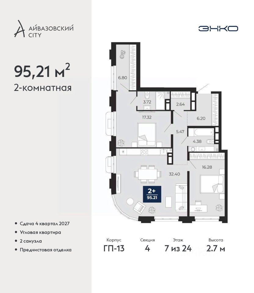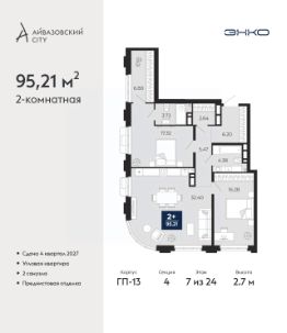 Продается 2-комн. квартира с предчистовой отделкой в ЖК "Айвазовский" на 7 этаже. Общая площадь: 95.21 кв.м., жилая: 33.6 кв.м., площадь просторной кухни-столовой: 32.4 кв.м. Угловая квартира, очень светлая, естественная вентиляция при открытии окон. В квартире два совмещенных санузла. Высота потолков 2.7 м.