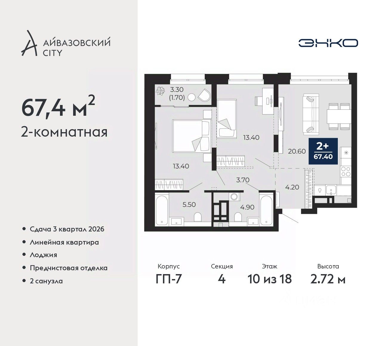 Просторная 2-комн. квартира с предчистовой отделкой в ЖК "Айвазовский City" на 10 этаже. Общая площадь: 67.4 кв.м., жилая: 26.8 кв.м., площадь просторной кухни-столовой: 20.6 кв.м. Комнаты изолированные, все окна выходят на одну сторону. В квартире одна лоджия, два совмещенных санузла. Высота потолков 2.72 м.