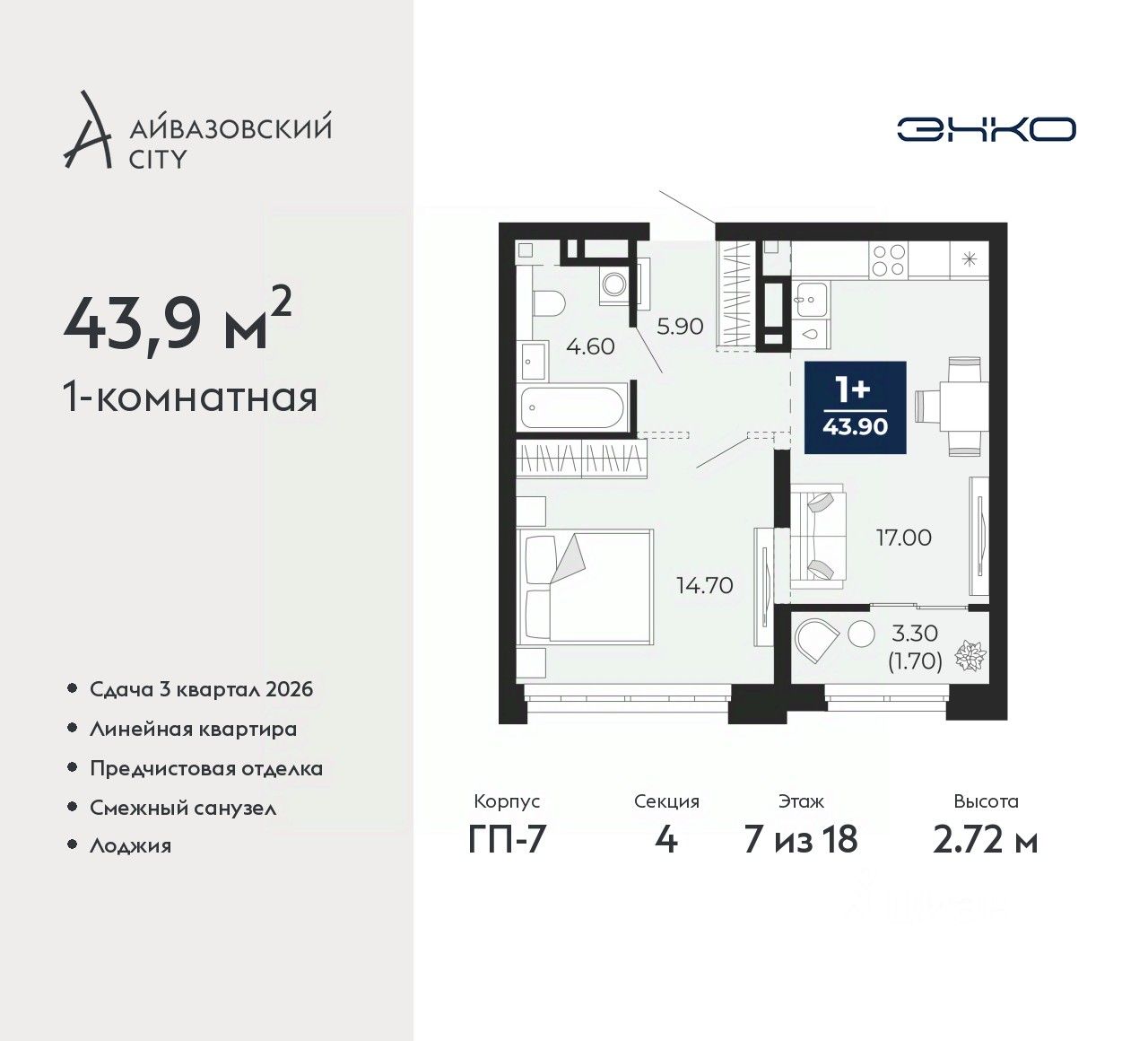 1-комн. квартира с предчистовой отделкой в ЖК "Айвазовский City" на 7 этаже. Общая площадь: 43.9 кв.м., жилая: 14.7 кв.м., площадь просторной кухни-столовой: 17 кв.м. Все окна выходят на одну сторону. В квартире одна лоджия, один совмещенный санузел. Высота потолков 2.72 м.