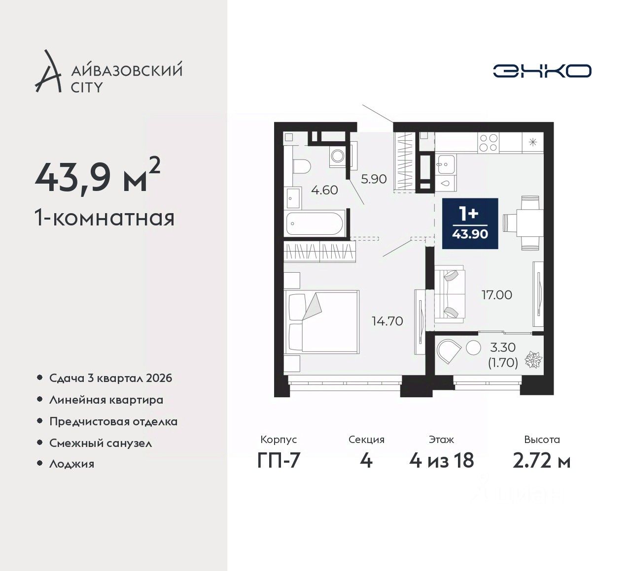 Просторная однокомнатная квартира с предчистовой отделкой в ЖК "Айвазовский City" на 4 этаже. Общая площадь: 43.9 кв.м., жилая: 14.7 кв.м., площадь просторной кухни-столовой: 17 кв.м. Все окна выходят на одну сторону. В квартире одна лоджия, один совмещенный санузел. Высота потолков 2.72 м.