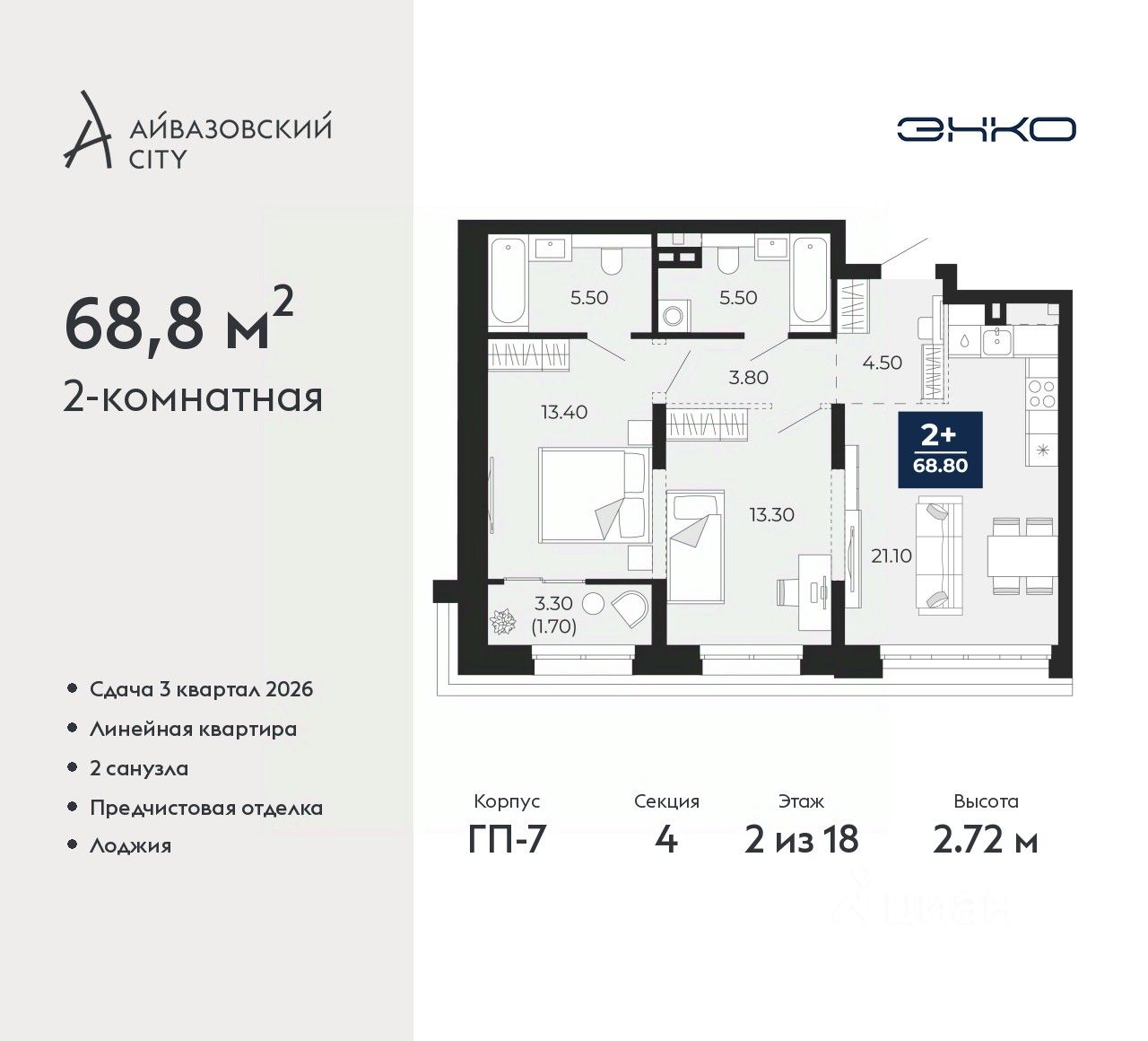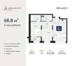 Двухкомнатная квартира с предчистовой отделкой в ЖК "Айвазовский City" на 2 этаже. Общая площадь: 68.8 кв.м., жилая: 26.7 кв.м., площадь просторной кухни-столовой: 21.1 кв.м. Комнаты изолированные, все окна выходят на одну сторону. В квартире одна лоджия, два совмещенных санузла. Высота потолков 2.72 м.