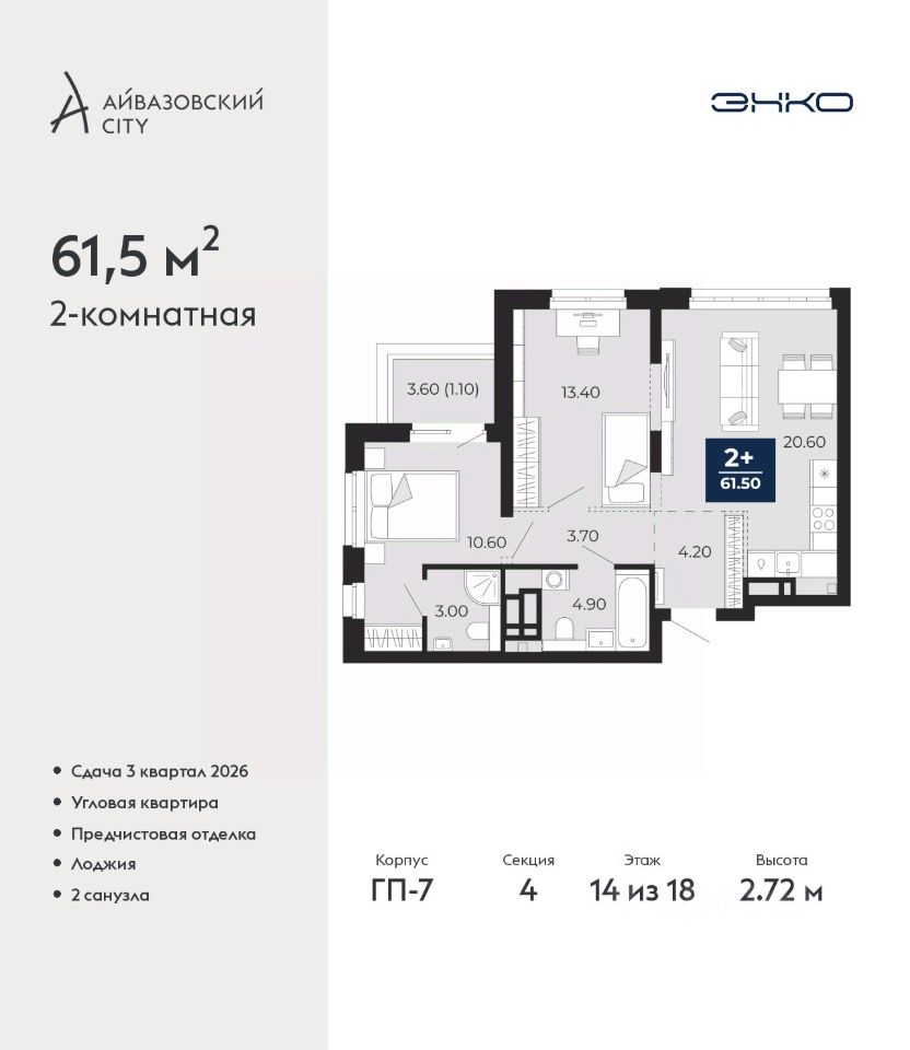 2-комн. квартира с предчистовой отделкой в ЖК "Айвазовский City" на 14 этаже. Общая площадь: 61.5 кв.м., жилая: 24 кв.м., площадь просторной кухни-столовой: 20.6 кв.м. Угловая квартира, идеально подойдет любителям тишины и панорамных видов. В квартире одна лоджия, два совмещенных санузла. Высота потолков 2.72 м.