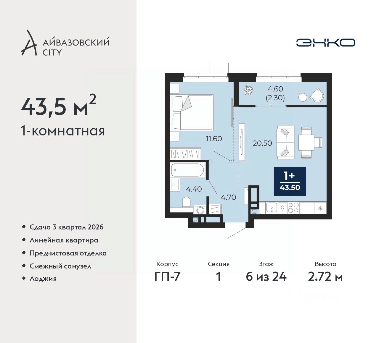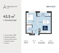 Просторная 1-комн. квартира с предчистовой отделкой в ЖК "Айвазовский City" на 6 этаже. Общая площадь: 43.5 кв.м., жилая: 11.6 кв.м., площадь просторной кухни-столовой: 20.5 кв.м. Все окна выходят на одну сторону. В квартире одна лоджия, один совмещенный санузел. Высота потолков 2.72 м.
