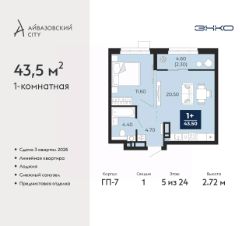 1-комн. квартира с предчистовой отделкой в ЖК "Айвазовский City" на 5 этаже. Общая площадь: 43.5 кв.м., жилая: 11.6 кв.м., площадь просторной кухни-столовой: 20.5 кв.м. Все окна выходят на одну сторону. В квартире одна лоджия, один совмещенный санузел. Высота потолков 2.72 м.