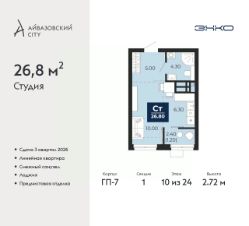 1-комн. квартира-студия от застройщика с предчистовой отделкой в ЖК "Айвазовский City" на 10 этаже. Общая площадь: 26.8 кв.м., площадь гостиной 17.1 кв.м., из которых 6.7 кв.м. выделено под кухонную зону. Все окна выходят на одну сторону. В квартире одна лоджия, один совмещенный санузел. Высота потолков 2.72 м.