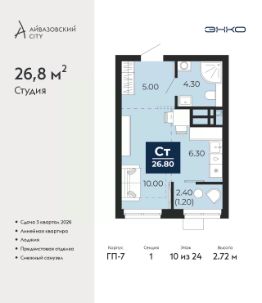 Просторная однокомнатная квартира-студия с предчистовой отделкой в ЖК "Айвазовский City" на 10 этаже. Общая площадь: 26.8 кв.м., площадь гостиной 17.1 кв.м., из которых 6.7 кв.м. выделено под кухонную зону. Все окна выходят на одну сторону. В квартире одна лоджия, один совмещенный санузел. Высота потолков 2.72 м.