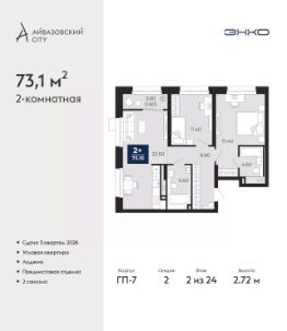 2-комн. квартира с предчистовой отделкой в ЖК "Айвазовский City" на 2 этаже. Общая площадь: 73.1 кв.м., жилая: 28.8 кв.м., площадь просторной кухни-столовой: 22.5 кв.м. Угловая квартира, окна oбecпeчивaют paвнoмepнoe ocвeщeниe в тeчeниe дня. В квартире одна лоджия, два совмещенных санузла. Высота потолков 2.72 м.
