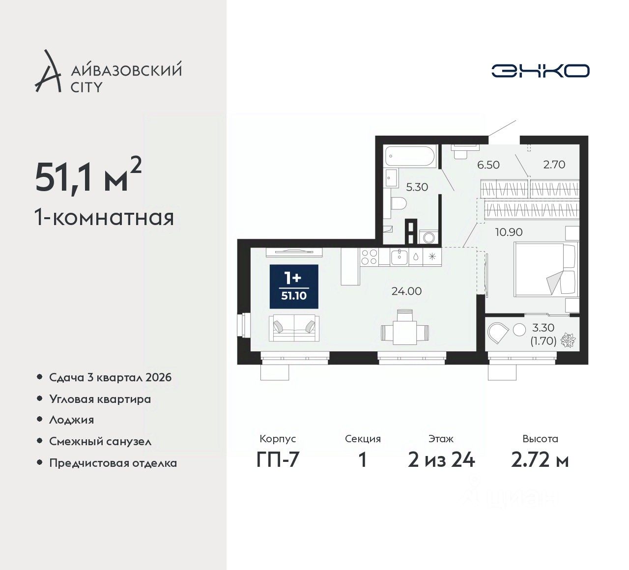 Продается 1-комн. квартира от застройщика с предчистовой отделкой в ЖК "Айвазовский City" на 2 этаже. Общая площадь: 51.1 кв.м., жилая: 10.9 кв.м., площадь просторной кухни-столовой: 24 кв.м. Квартира угловая, окна oбecпeчивaют paвнoмepнoe ocвeщeниe в тeчeниe дня. В квартире одна лоджия, один совмещенный санузел. Высота потолков 2.72 м.