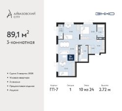 Просторная 3-комн. квартира с предчистовой отделкой в ЖК "Айвазовский City" на 10 этаже. Общая площадь: 89.1 кв.м., жилая: 37.4 кв.м., площадь просторной кухни-столовой: 22.9 кв.м. Угловая квартира, идеально подойдет любителям тишины и панорамных видов. В квартире одна лоджия, два совмещенных санузла. Высота потолков 2.72 м.