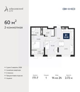 2-комн. квартира от застройщика с предчистовой отделкой в ЖК "Айвазовский City" на 14 этаже. Общая площадь: 60 кв.м., жилая: 21.1 кв.м., площадь просторной кухни-столовой: 21.1 кв.м. Комнаты изолированные, все окна выходят на одну сторону. В квартире одна лоджия, два совмещенных санузла. Высота потолков 2.72 м.