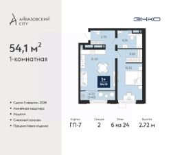 1-комн. квартира с предчистовой отделкой в ЖК "Айвазовский City" на 6 этаже. Общая площадь: 54.1 кв.м., жилая: 15.3 кв.м., площадь просторной кухни-столовой: 22 кв.м. Все окна выходят на одну сторону. В квартире одна лоджия, один совмещенный санузел. Высота потолков 2.72 м.