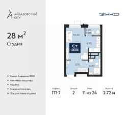 Просторная однокомнатная квартира-студия с предчистовой отделкой в ЖК "Айвазовский City" на 11 этаже. Общая площадь: 28 кв.м., площадь гостиной 17.1 кв.м., из которых 6.7 кв.м. выделено под кухонную зону. Все окна выходят на одну сторону. В квартире одна лоджия, один совмещенный санузел. Высота потолков 2.72 м.