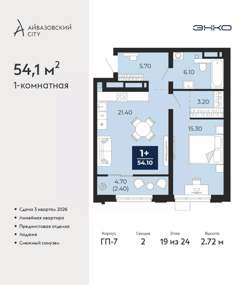Однокомнатная квартира с предчистовой отделкой в ЖК "Айвазовский City" на 19 этаже. Общая площадь: 54.1 кв.м., жилая: 15.3 кв.м., площадь просторной кухни-столовой: 22 кв.м. Все окна выходят на одну сторону. В квартире одна лоджия, один совмещенный санузел. Высота потолков 2.72 м.