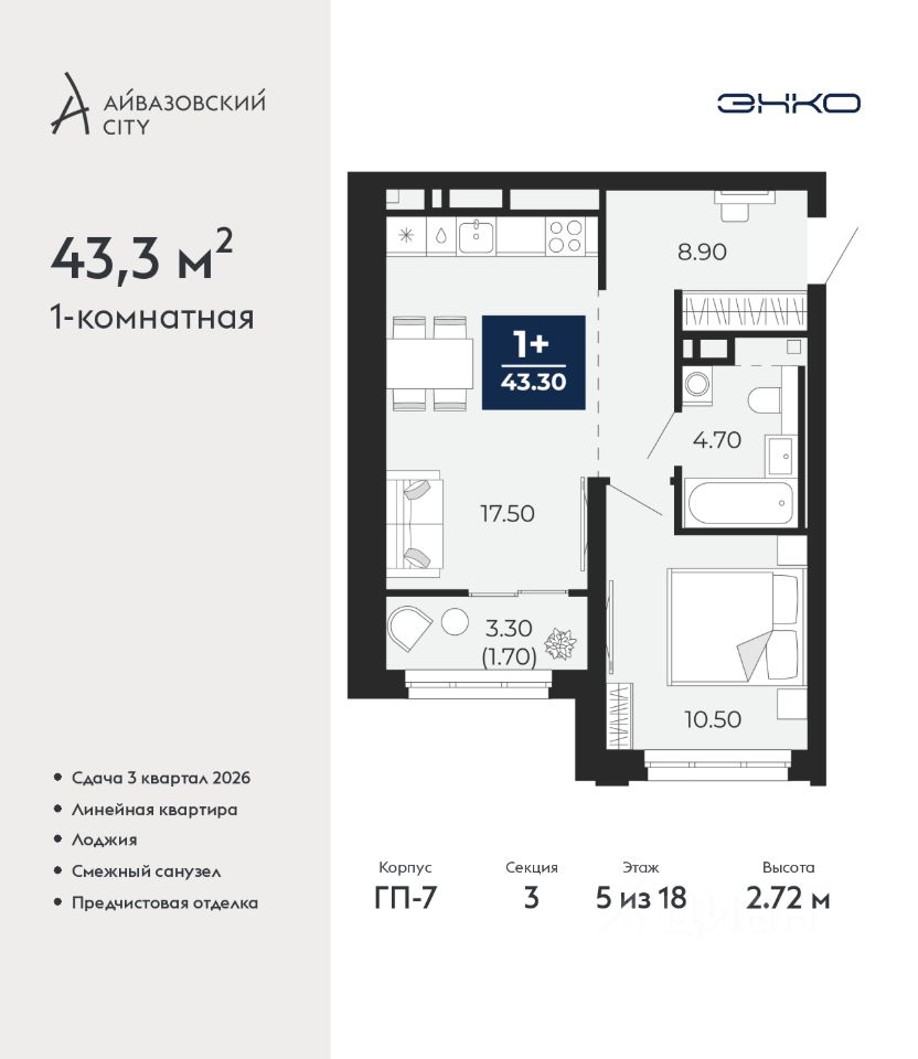 Просторная 1-комн. квартира с предчистовой отделкой в ЖК "Айвазовский City" на 5 этаже. Общая площадь: 43.3 кв.м., жилая: 10.5 кв.м., площадь просторной кухни-столовой: 17.5 кв.м. Все окна выходят на одну сторону. В квартире одна лоджия, один совмещенный санузел. Высота потолков 2.72 м.
