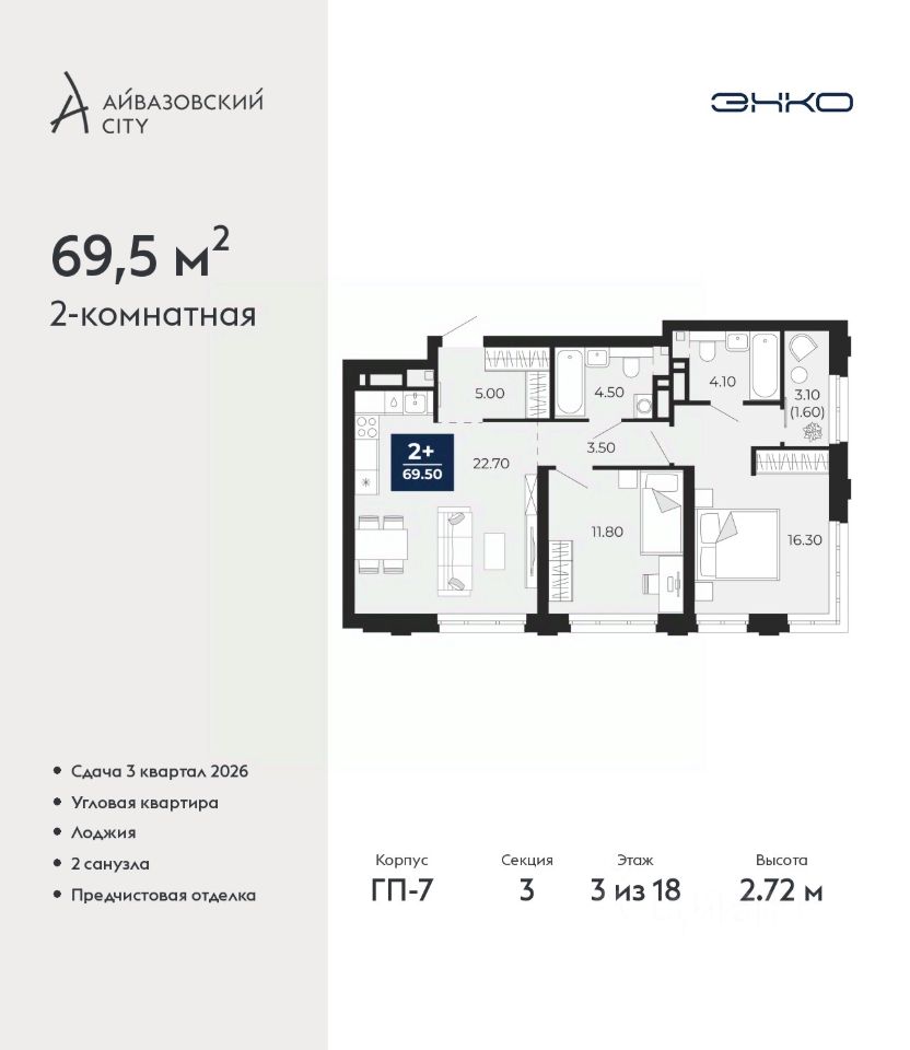 Двухкомнатная квартира от застройщика с предчистовой отделкой в ЖК "Айвазовский City" на 3 этаже. Общая площадь: 69.5 кв.м., жилая: 28.1 кв.м., площадь просторной кухни-столовой: 22.7 кв.м. Квартира угловая, очень светлая, естественная вентиляция при открытии окон. В квартире одна лоджия, два совмещенных санузла. Высота потолков 2.72 м.