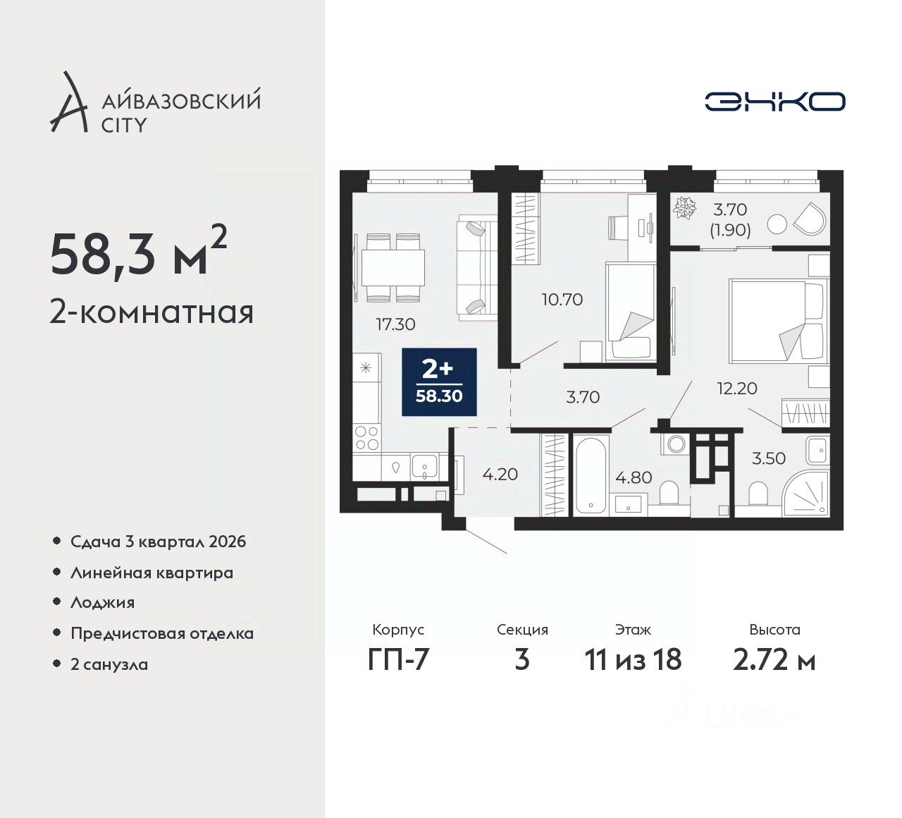 Продается 2-комн. квартира от застройщика с предчистовой отделкой в ЖК "Айвазовский City" на 11 этаже. Общая площадь: 58.3 кв.м., жилая: 22.9 кв.м., площадь просторной кухни-столовой: 17.3 кв.м. Комнаты изолированные, все окна выходят на одну сторону. В квартире одна лоджия, два совмещенных санузла. Высота потолков 2.72 м.