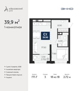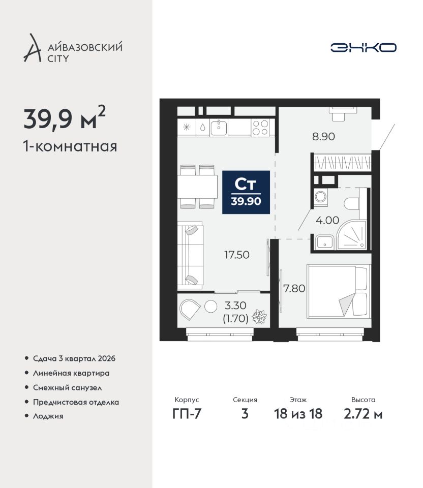 Продается 1-комн. квартира от застройщика с предчистовой отделкой в ЖК "Айвазовский City" на 18 этаже. Общая площадь: 39.9 кв.м., жилая: 7.8 кв.м., площадь просторной кухни-столовой: 17.5 кв.м. Все окна выходят на одну сторону. В квартире одна лоджия, один совмещенный санузел. Высота потолков 2.72 м.