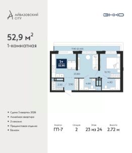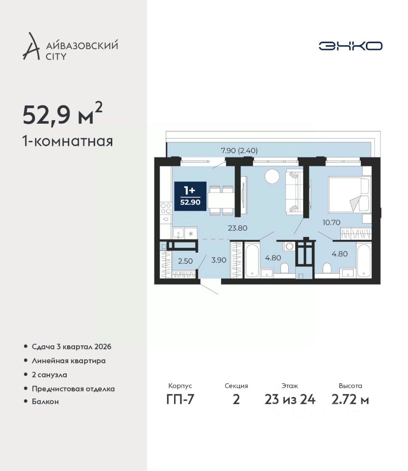 Просторная 1-комн. квартира с предчистовой отделкой в ЖК "Айвазовский City" на 23 этаже. Общая площадь: 52.9 кв.м., жилая: 10.7 кв.м., площадь просторной кухни-столовой: 23.8 кв.м. Все окна выходят на одну сторону. В квартире один балкон, два совмещенных санузла. Терраса представляет собой роскошную зону отдыха, где вы на свой вкус можете создать атмосферу комфорта и уюта. Высота потолков 2.72 м.