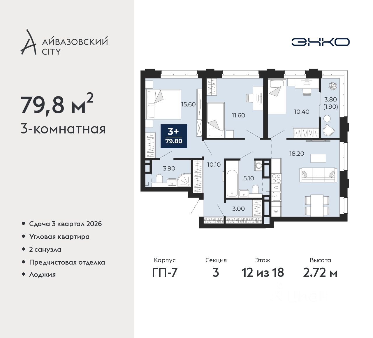 Трехкомнатная квартира с предчистовой отделкой в ЖК "Айвазовский City" на 12 этаже. Общая площадь: 79.8 кв.м., жилая: 37.6 кв.м., площадь просторной кухни-столовой: 18.2 кв.м. Угловая квартира, очень светлая, естественная вентиляция при открытии окон. В квартире одна лоджия, два совмещенных санузла. Высота потолков 2.72 м.