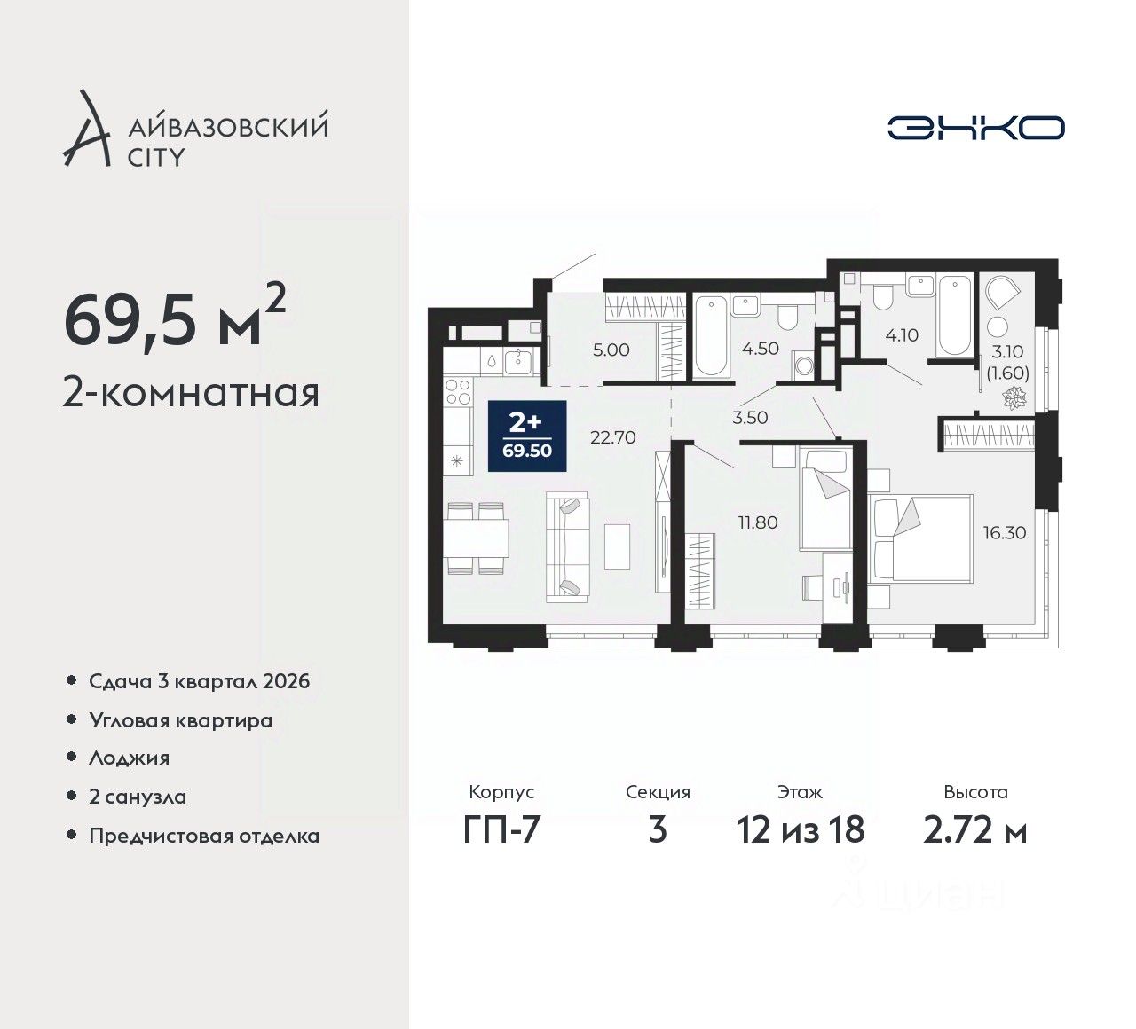Продается 2-комн. квартира от застройщика с предчистовой отделкой в ЖК "Айвазовский City" на 12 этаже. Общая площадь: 69.5 кв.м., жилая: 28.1 кв.м., площадь просторной кухни-столовой: 22.7 кв.м. Квартира угловая, идеально подойдет любителям тишины и панорамных видов. В квартире одна лоджия, два совмещенных санузла. Высота потолков 2.72 м.