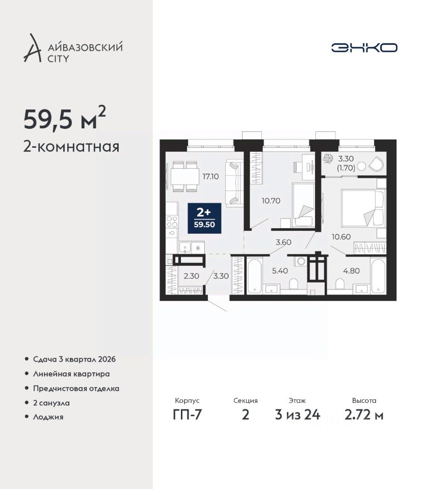 Продается 2-комн. квартира от застройщика с предчистовой отделкой в ЖК "Айвазовский City" на 3 этаже. Общая площадь: 59.5 кв.м., жилая: 21.3 кв.м., площадь просторной кухни-столовой: 17.1 кв.м. Комнаты изолированные, все окна выходят на одну сторону. В квартире одна лоджия, два совмещенных санузла. Высота потолков 2.72 м.