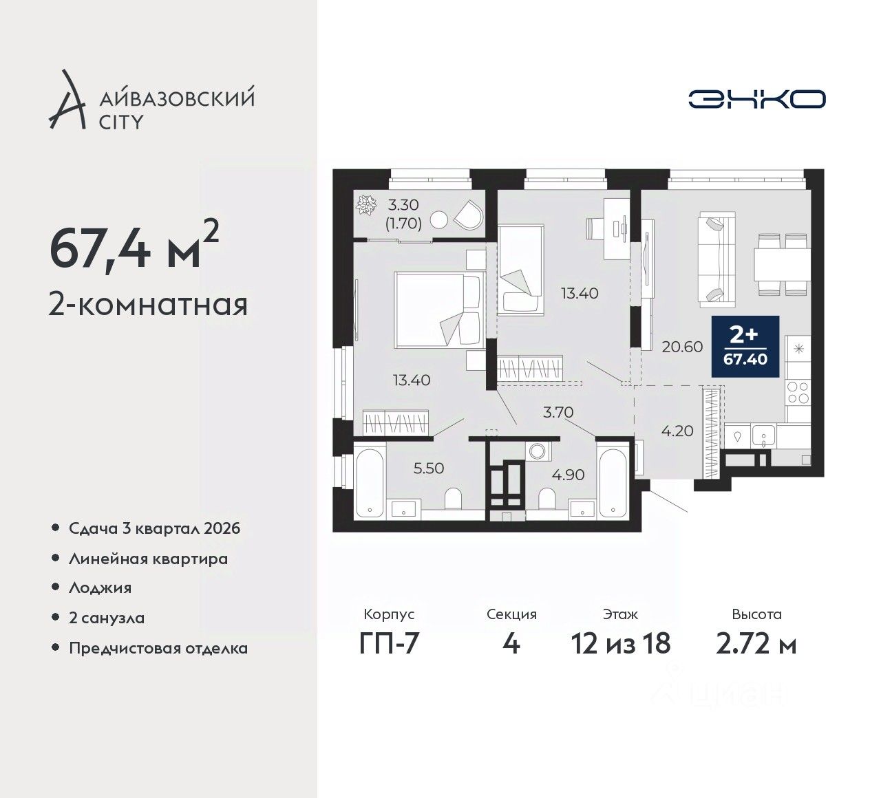 2-комн. квартира с предчистовой отделкой в ЖК "Айвазовский City" на 12 этаже. Общая площадь: 67.4 кв.м., жилая: 26.8 кв.м., площадь просторной кухни-столовой: 20.6 кв.м. Комнаты изолированные, все окна выходят на одну сторону. В квартире одна лоджия, два совмещенных санузла. Высота потолков 2.72 м.