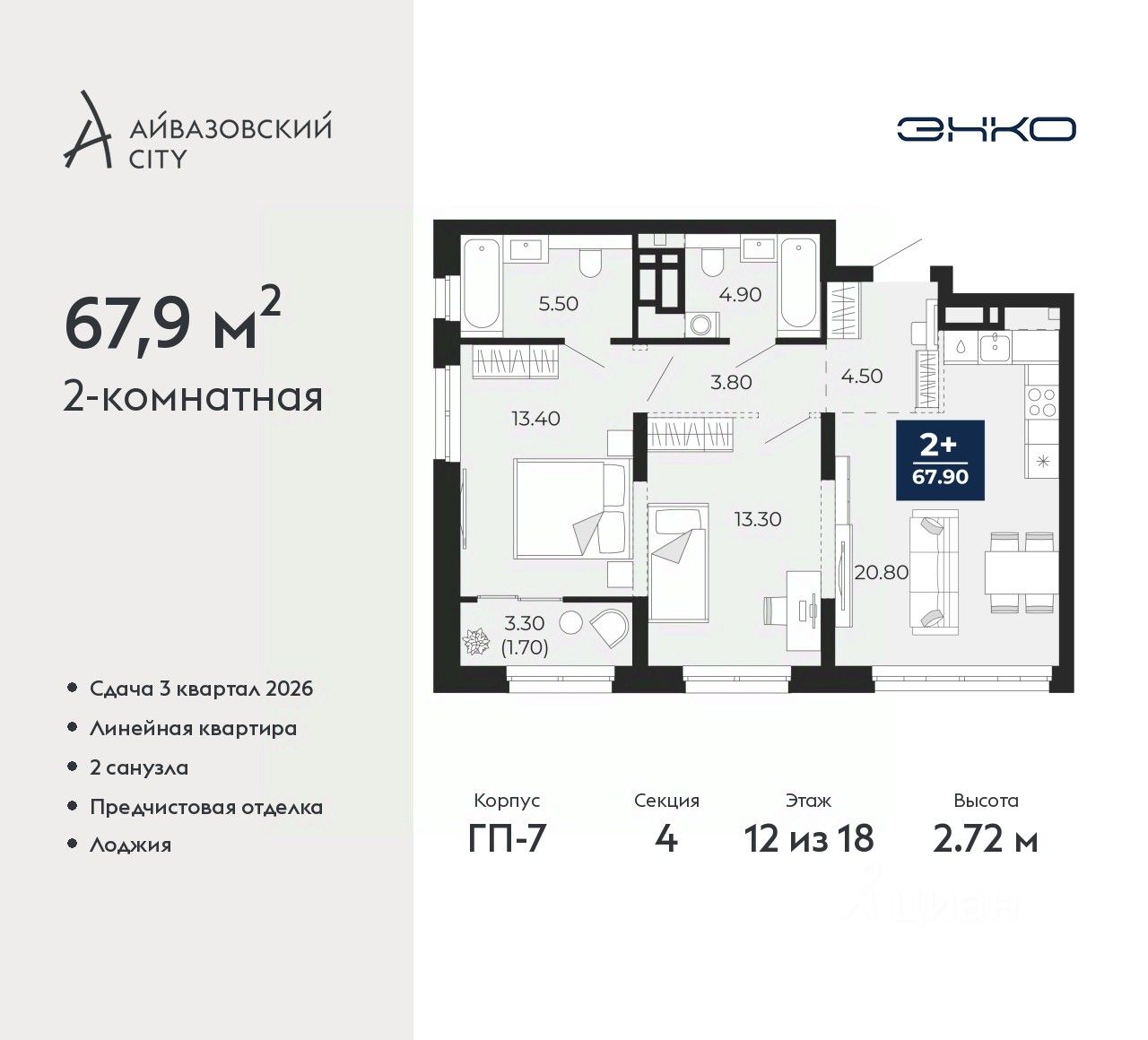 2-комн. квартира с предчистовой отделкой в ЖК "Айвазовский City" на 12 этаже. Общая площадь: 67.9 кв.м., жилая: 26.7 кв.м., площадь просторной кухни-столовой: 20.8 кв.м. Комнаты изолированные, все окна выходят на одну сторону. В квартире одна лоджия, два совмещенных санузла. Высота потолков 2.72 м.