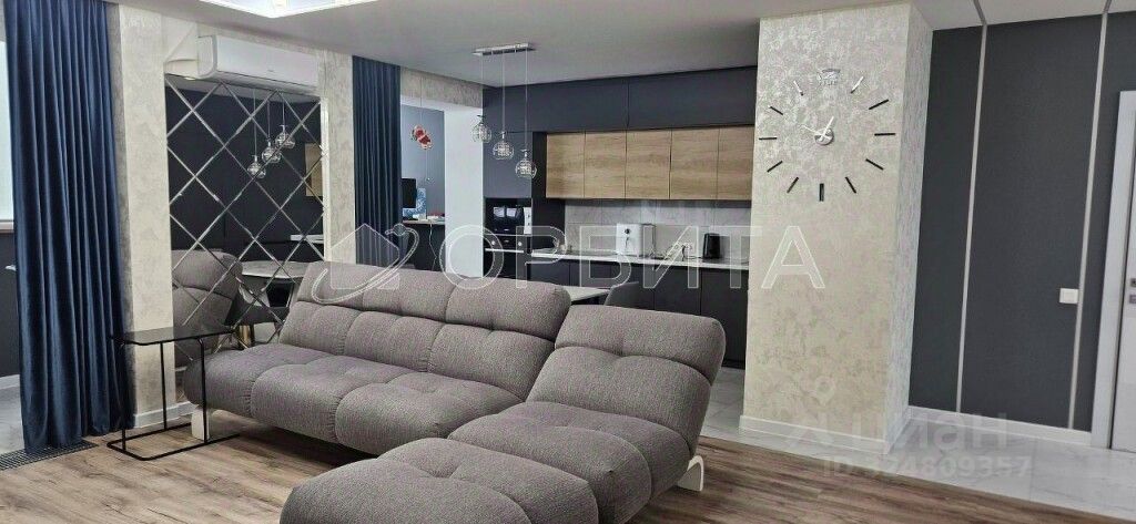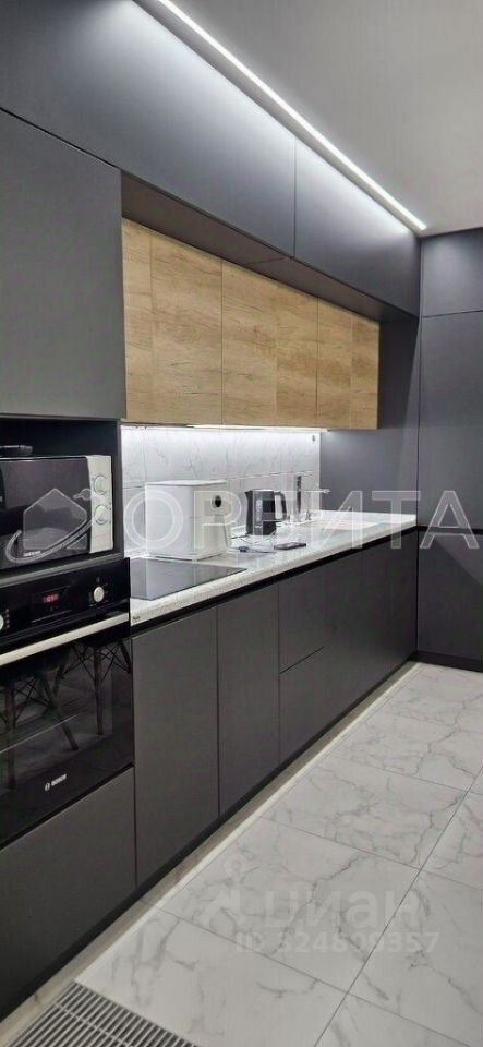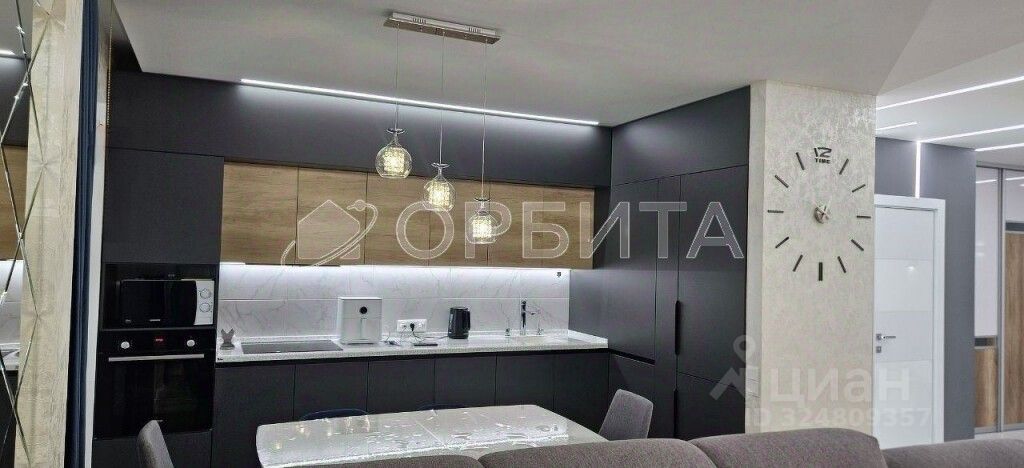Из окон открывается прекрасный вид, а интерьер квартиры выполнен с использованием дорогих материалов. Кухонный гарнитур с каменной столешницей и вместительными шкафами оснащён фурнитурой Blum, что обеспечивает долговечность и функциональность.