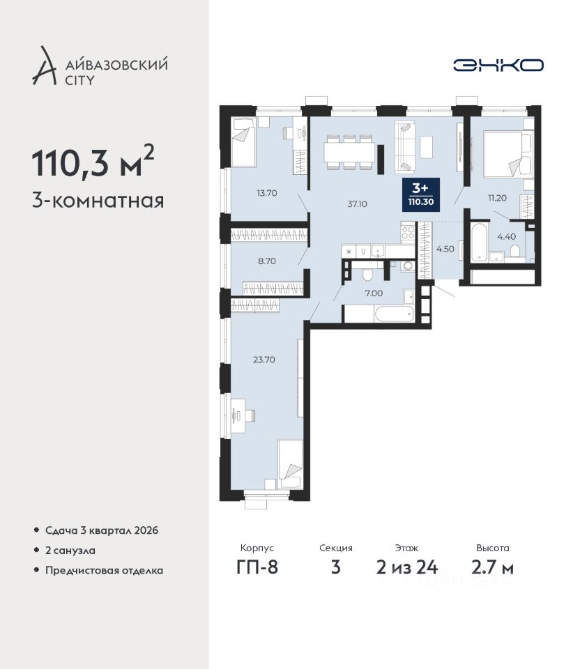 Просторная 3-комн. квартира с предчистовой отделкой в ЖК "Айвазовский City" на 2 этаже. Общая площадь: 110.3 кв.м., жилая: 48.6 кв.м., площадь просторной кухни-столовой: 37.1 кв.м. Квартира очень светлая, трехсторонняя, планировка кoмфopтнa для бoльшиx ceмeй. В квартире два совмещенных санузла. Высота потолков 2.7 м.