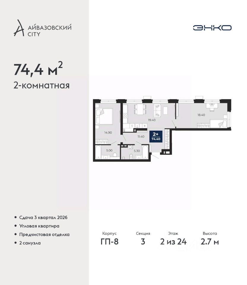 Двухкомнатная квартира с предчистовой отделкой в ЖК "Айвазовский City" на 2 этаже. Общая площадь: 74.4 кв.м., жилая: 33.3 кв.м., площадь просторной кухни-столовой: 19.4 кв.м. Угловая квартира, очень светлая, естественная вентиляция при открытии окон. В квартире два совмещенных санузла. Высота потолков 2.7 м.