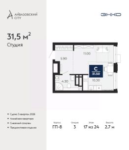 Продается однокомнатная квартира-студия от застройщика с предчистовой отделкой в ЖК "Айвазовский City" на 17 этаже. Общая площадь: 31.5 кв.м., площадь гостиной 21.3 кв.м., из которых 10.3 кв.м. выделено под кухонную зону. Все окна выходят на одну сторону. В квартире один совмещенный санузел. Высота потолков 2.7 м.