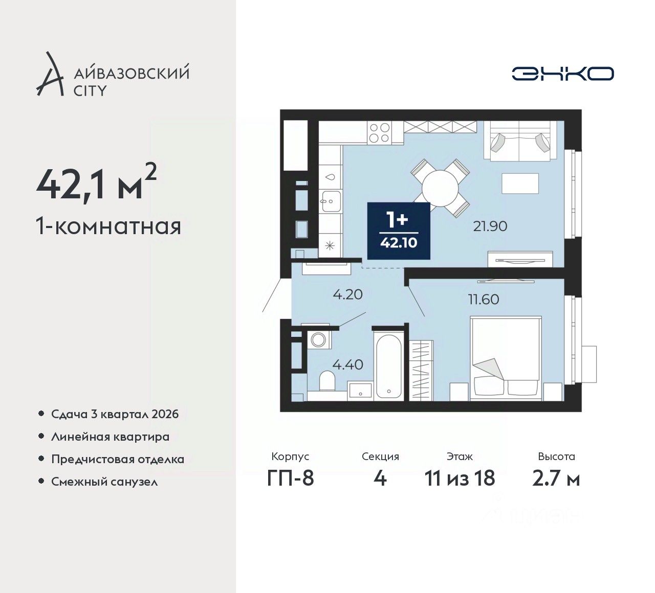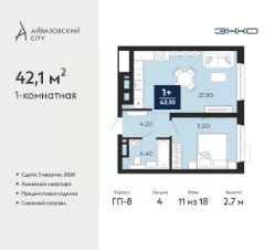 Однокомнатная квартира с предчистовой отделкой в ЖК "Айвазовский City" на 11 этаже. Общая площадь: 42.1 кв.м., жилая: 11.6 кв.м., площадь просторной кухни-столовой: 21.9 кв.м. Все окна выходят на одну сторону. В квартире один совмещенный санузел. Высота потолков 2.7 м.