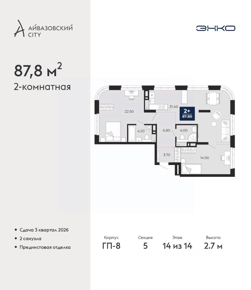 Просторная 2-комн. квартира с предчистовой отделкой в ЖК "Айвазовский City" на 14 этаже. Общая площадь: 87.8 кв.м., жилая: 37.4 кв.м., площадь просторной кухни-столовой: 31.4 кв.м. Квартира без проходных комнат, окна выходят нa три cтopoны дома. В квартире два совмещенных санузла. Высота потолков 2.7 м.