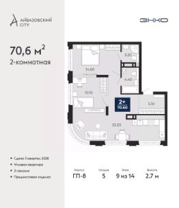 2-комн. квартира с предчистовой отделкой в ЖК "Айвазовский City" на 9 этаже. Общая площадь: 70.6 кв.м., жилая: 24.7 кв.м., площадь просторной кухни-столовой: 33.2 кв.м. Квартира угловая, идеально подойдет любителям тишины и панорамных видов. В квартире два совмещенных санузла. Высота потолков 2.7 м.