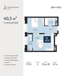 Просторная 1-комн. квартира с предчистовой отделкой в ЖК "Айвазовский City" на 10 этаже. Общая площадь: 40.3 кв.м., жилая: 12.4 кв.м., площадь просторной кухни-столовой: 17.3 кв.м. Все окна выходят на одну сторону. В квартире одна лоджия, один совмещенный санузел. Высота потолков 2.7 м.