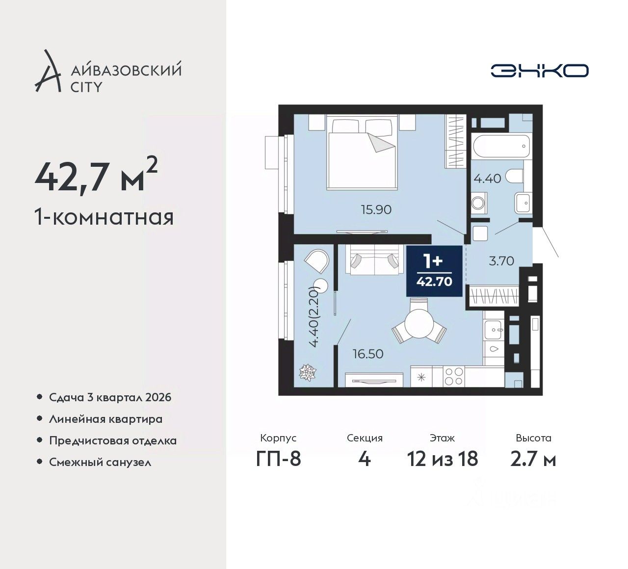 1-комн. квартира от застройщика с предчистовой отделкой в ЖК "Айвазовский City" на 12 этаже. Общая площадь: 42.7 кв.м., жилая: 11.6 кв.м., площадь просторной кухни-столовой: 22.2 кв.м. Все окна выходят на одну сторону. В квартире один совмещенный санузел. Высота потолков 2.7 м.