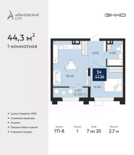 Продается 1-комн. квартира с предчистовой отделкой в ЖК "Айвазовский City" на 7 этаже. Общая площадь: 44.3 кв.м., жилая: 12.5 кв.м., площадь просторной кухни-столовой: 18.4 кв.м. Все окна выходят на одну сторону. В квартире одна лоджия, один совмещенный санузел. Высота потолков 2.7 м.