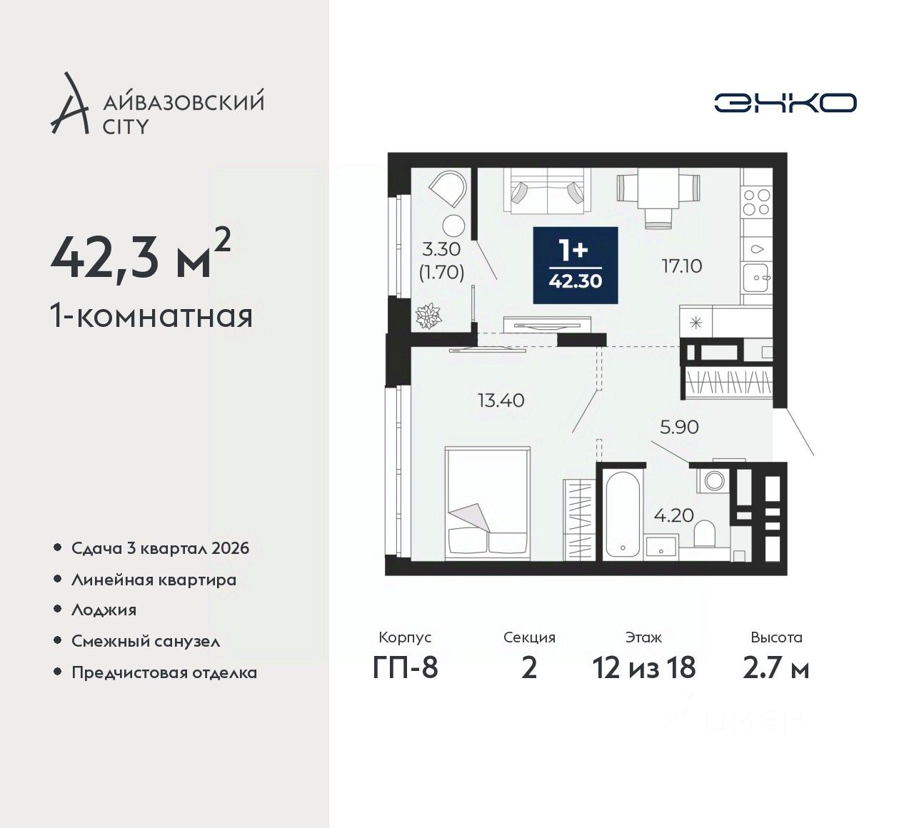 1-комн. квартира от застройщика с предчистовой отделкой в ЖК "Айвазовский City" на 12 этаже. Общая площадь: 42.3 кв.м., жилая: 13.4 кв.м., площадь просторной кухни-столовой: 17.1 кв.м. Все окна выходят на одну сторону. В квартире одна лоджия, один совмещенный санузел. Высота потолков 2.7 м.