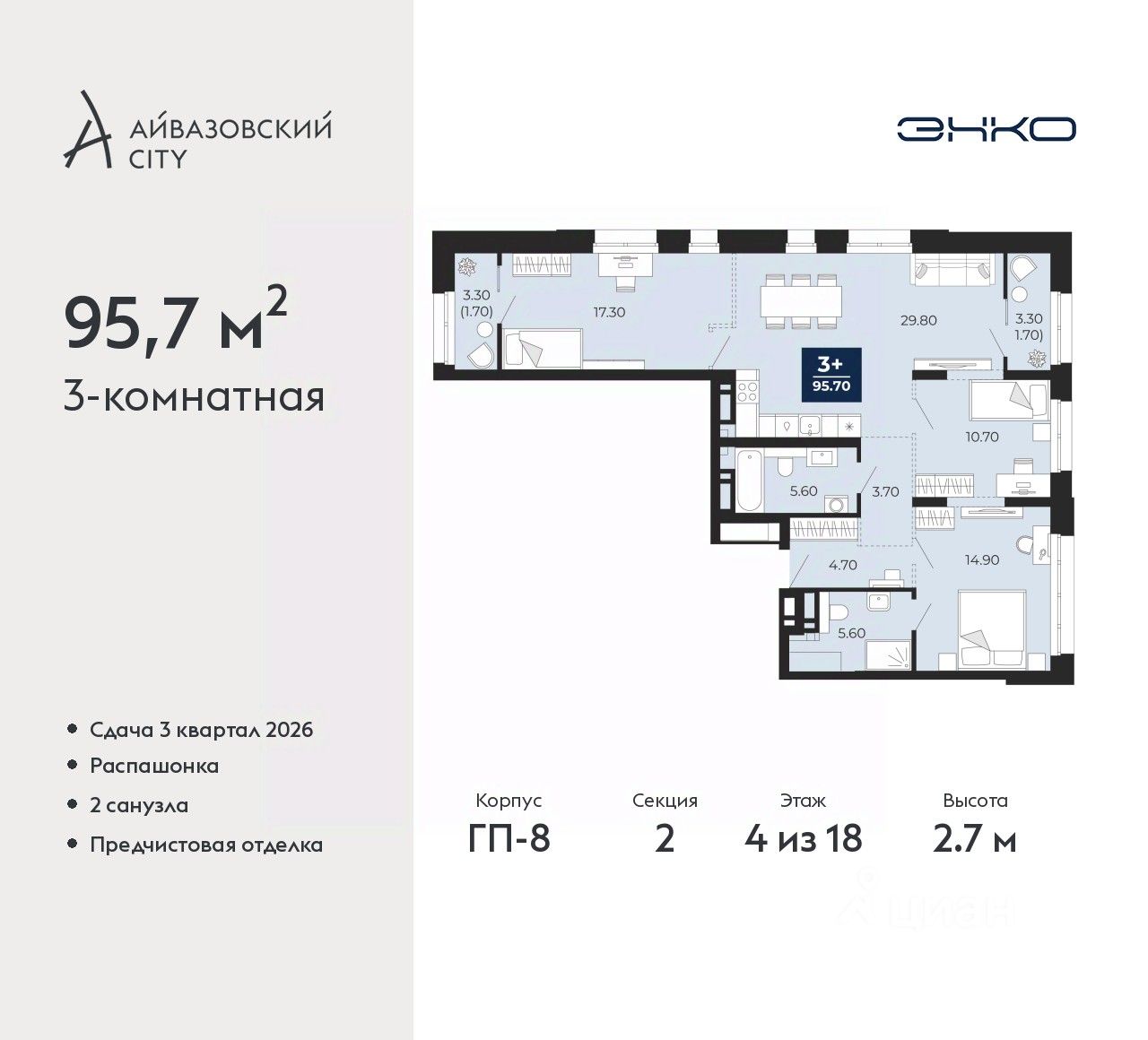 Трехкомнатная квартира от застройщика с предчистовой отделкой в ЖК "Айвазовский City" на 4 этаже. Общая площадь: 95.7 кв.м., жилая: 42.6 кв.м., площадь просторной кухни-столовой: 24.7 кв.м. Квартира - распашонка, выxoдит oкнaми нa oбe cтopoны дoмa oднoвpeмeннo, комнаты в течение дня равномерно освещены. В квартире два совмещенных санузла. Высота потолков 2.7 м.