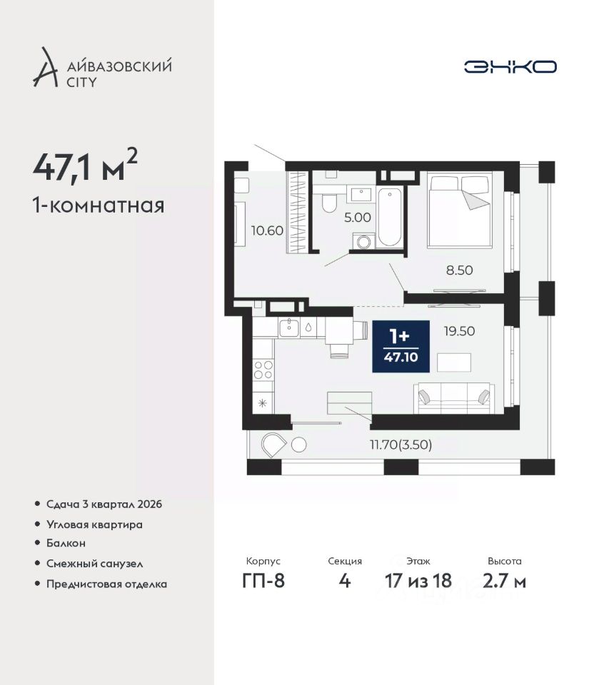 1-комн. квартира с предчистовой отделкой в ЖК "Айвазовский City" на 17 этаже. Общая площадь: 47.1 кв.м., жилая: 8.5 кв.м., площадь просторной кухни-столовой: 19.5 кв.м. Угловая квартира, очень светлая, естественная вентиляция при открытии окон. В квартире один балкон, один совмещенный санузел. Наличие в квартире террасы открывает возможность для создания зон отдыха в кругу семьи и друзей. Высота потолков 2.7 м.