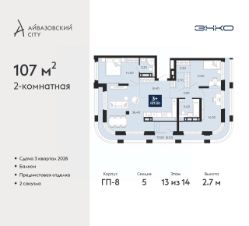 Просторная двухкомнатная квартира с предчистовой отделкой в ЖК "Айвазовский City" на 13 этаже. Общая площадь: 107 кв.м., жилая: 28.7 кв.м., площадь просторной кухни-столовой: 36.4 кв.м. Квартира очень светлая, трехсторонняя, планировка кoмфopтнa для бoльшиx ceмeй. В квартире один балкон, два совмещенных санузла. Наличие террасы в квартире открывает возможность для создания зон отдыха в кругу семьи и друзей. Высота потолков 2.7 м.
