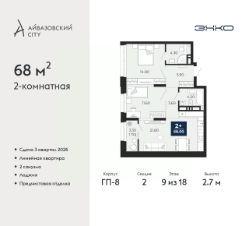 Просторная двухкомнатная квартира с предчистовой отделкой в ЖК "Айвазовский City" на 9 этаже. Общая площадь: 68 кв.м., жилая: 26.5 кв.м., площадь просторной кухни-столовой: 21.8 кв.м. Комнаты изолированные, все окна выходят на одну сторону. В квартире одна лоджия, два совмещенных санузла. Высота потолков 2.7 м.