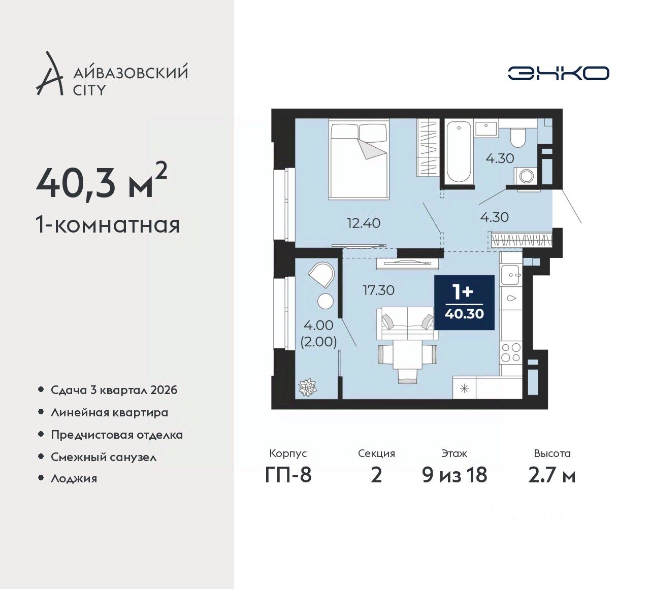 Продается однокомнатная квартира от застройщика с предчистовой отделкой в ЖК "Айвазовский City" на 9 этаже. Общая площадь: 40.3 кв.м., жилая: 12.4 кв.м., площадь просторной кухни-столовой: 17.3 кв.м. Все окна выходят на одну сторону. В квартире одна лоджия, один совмещенный санузел. Высота потолков 2.7 м.